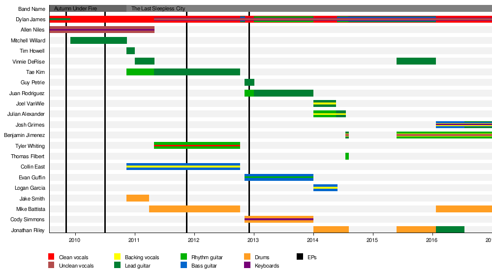 Mitchell Willard left the band in late 2010. Following his loss, Dylan and Allen started looking for people to replace him, and found Jake Smith, Tim Howell, Collin East and Tae Kim. With this six-member lineup, the band changed its name to The Last Sleepless City.[6] As Autumn Under Fire songs had a very electronic sound, The Last Sleepless City would include more pop-punk aspects to their music.[3] The band started working on a CD shortly after their name change,[1] and played a live show for its release.[3]