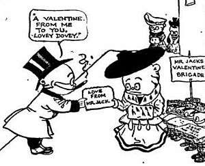 Swinnerton's talents drew attention in the Hearst chain, and in 1896 he was invited to draw cartoons for The New York Journal. Apparently at Hearst's request, he shifted his characters from bears to tigers, the emblem of Tammany Hall, creating The Little Tigers.[1][2] At first fairly generic, over time individual characters began to emerge, the most popular being the womanizing playboy "Mr. Jack", who first appeared around 1898. Mr. Jack got his own Sunday strip starting on November 1, 1903.[2] While previous animal characters in art and fiction were often given some human features, such as clothing and speech, Swinnerton went a step further with Mr. Jack by giving him an essentially human body below his tiger head, complete with hands rather than paws and an upright stance. As such, comics historian Don Markstein wrote that he was probably "the first fully-realized funny animal", a character type that would soon become very well established in comics and other media.[2][3]