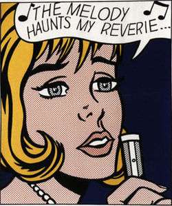 The woman on the image, holding a microphone, was likened to modern character of Betty Draper from Mad Men.[2] The painting was described as being among those that "don't lower art to the level of the comic strip but raise the comic strip to the level of high art".[3] A version of The Melody Haunts My Reverie from 11 Pop Artists, Volume II was recently sold at Sotheby's for $137,500.[4]