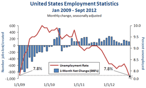 Ultimately, Grunwald accounts how Obama's $787 billion stimulus package amounted to about 4% of America’s GDP while, during the Great Depression, the biggest stimulus in any year amounted to just about 1.5% of GDP. The President's early, pre-inauguration plan, at $300 billion, increased given the particularly frustrating unemployment situation. Early 2009 data had presented losses of around 800,000 a month.[2]