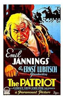 The Patriot is a 1928 semi-biographical film that was directed by Ernst Lubitsch and released by Paramount Pictures. While mainly a silent film, the film did have a synchronized soundtrack as well as some talking sequences. The film was written by Hanns Kräly; it is an adaptation of two plays: Paul I by Dmitry Merezhkovsky and The Patriot by Ashley Dukes (based on the novel Der Patriot by Alfred Neumann). The Dukes play was performed on Broadway in January 1928.[1] John Gielgud made his Broadway debut in that play. The movie is a biographical story of emperor Paul I of Russia, starring Emil Jannings, Florence Vidor and Lewis Stone.[2]