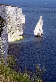 The Pinnacles are two chalk formations, including a stack and a stump, located near Handfast Point, on the Isle of Purbeck in Dorset, southern England.