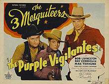 The Purple Vigilantes is a 1938 American Western film directed by George Sherman and starring Robert Livingston, Ray Corrigan, and Max Terhune. Written by Betty Burbridge and Oliver Drake, the film is about a rancher who organizes other ranchers to form a vigilante group in order to rid their town of outlaws. After the outlaws are defeated, some of the men, posing as the vigilant group, go on a crime spree. The Purple Vigilantes is the 12th entry in the Three Mesquiteers series of B-movies produced by Republic Pictures.[1] The film was released in the United Kingdom as Purple Riders.