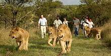 In addition to horseback safaris and game drives, an annual government licence permits rare initiatives such as the "Walk with Lions" experience, a major tourist attraction in Limpopo Province.[9] The lions also feature in educational outreach programmes, including initiatives aimed at facilitating close contact with wildlife for groups such as young people, the handicapped and visually handicapped.