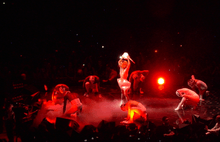 In the United States, The Remix charted at number six on the Billboard 200 dated August 21, 2010, with 39,000 copies sold.[27] It became Gaga's third top ten album on the Billboard 200. It also debuted at number one on Billboard's Dance/Electronic Albums making this Gaga's third number one entry on the chart.[28] The same week, her studio albums The Fame and The Fame Monster were at positions two and three respectively. Billboard chart manager Keith Caulfield noted that Gaga became the first act to occupy the chart's top three positions, in its nine-year history.[29] She additionally charted on the Billboard 200 with The Fame at number 12 and The Fame Monster at number 27, marking the first time an artist placed three concurrent titles in the top 30 since 1993, when Garth Brooks last achieved the feat on the January 23, 1993, chart by placing four sets in the top 30: The Chase at number two, Beyond the Season at number 23, Ropin' the Wind at number 26 and No Fences at number 29.[30] According to Nielsen SoundScan, The Remix has sold 314,000 copies in US as of April 2016.[31] In Canada, the album debuted at number five on the Canadian Albums Chart issue dated May 22, 2010, and remained on the chart for a total of ten weeks.[32][33] The Remix has sold more than 500,000 copies worldwide, and it is among the best-selling remix albums of all time.[5]