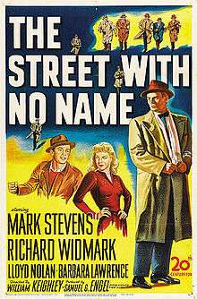 The Street with No Name is a 1948 film noir. The movie, a follow-up to The House on 92nd Street (1945), tells the story of an undercover FBI agent, Gene Cordell (Mark Stevens), who infiltrates a deadly crime gang. Cordell's superior, FBI Inspector George A. Briggs (Lloyd Nolan), also appears in The House on 92nd Street. The movie, shot in a semidocumentary style, takes place in the Skid Row section of fictional (actually Los Angeles) "Central City."[2]
