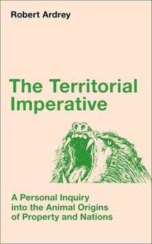 The Territorial Imperative: A Personal Inquiry Into the Animal Origins of Property and Nations, usually referred to as The Territorial Imperative, is a 1966 nonfiction work by Robert Ardrey. It describes the evolutionarily determined instinct among humans toward territoriality and the implications of this territoriality in human meta-phenomena such as property ownership and nation building .[1] The Territorial Imperative extended Ardrey's groundbreaking anthropological work, contributed to the development of the science of ethology, and encouraged an increasing public interest in human origins.
