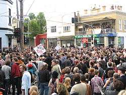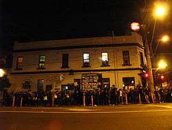 At 6pm on Sunday, 17 January, an estimated crowd of between 2,000[3] and 5,000 rallied outside the Tote, filling the intersection of Johnston and Wellington Streets and spilling down each street.[4] People found other vantage points on rooftops, upper story windows and balconies in the surrounding buildings. Amongst the crowd were amateur and professional photographers, film makers, a Tote documentary crew, various local independent music celebrities and a large collection of Melbourne's local independent musicians, patrons, long-time Tote patrons, former employees and others.