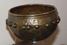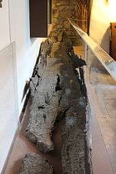 The exhibits include the metal "Glastonbury Bowl". It was made from two sections riveted together and repaired several times over its life. The bottom half has been dated as having been constructed in the Iron Age. The upper half was probably added in the 1st century from one sheet of metal, which may have been previously used for another purpose, and the two halves riveted together.[15][16] Other artefacts that form the village include a clay tuyère from a pair of bellows, whetstones, iron knives and iron currency bars, which could be used as tokens and exchanged for goods.[17][18] The glazed jar on display is a 1936 copy of one from the village site; however some of the original storage bowls are included in the displays which were re assembled by Arthur Bulleid, who discovered the site in 1892.[19][20] In the old kitchen at the rear of the building is a log boat excavated near the village.