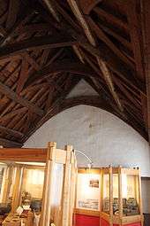 The building has two rooms and an attached kitchen on the ground floor with a staircase between them leading to the living quarters in the first floor rooms. The front room may originally have been a shop but was not used for trade after the installation of the new front wall in the 16th century.[6] The front room has recesses on either side of the arched fireplace.[8] The rear room on the ground floor was the hall and still has its 16th-century ceiling panels and four-light window. The ceiling has plaster decorations from the Elizabethan era, when the kitchen block was also added.[6][8]