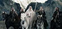 From left to right: Karl Urban, Bernard Hill, Ian McKellen, Orlando Bloom, and Viggo Mortensen. According to Peter Jackson, The Two Towers is centered around Aragorn.[11]