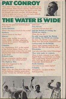 The Water Is Wide is a 1972 memoir [1] by Pat Conroy and is based on his work as a teacher on Daufuskie Island, South Carolina, which is called Yamacraw Island in the book. The book is sometimes identified as nonfiction[2] and other times identified as a novel.[3]