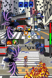 The game's combat system is called the Stride Cross Battle System. The combat takes place across both screens on the DS, with Neku on the touchscreen and his partner on the top screen, representing the different "zones" of the same local area; the two characters battle the same enemies that exist in both "zones" simultaneously. Neku and his partner are synchronized during battle; they share the same health bar so that even if one character does not take any damage, the pair can fail in battle if the other takes too much.[5] A green "light puck" will pass between the characters during battle; by alternating battle between the character who possesses the puck, damage is increased. The movement of the light puck is determined by the "sync ratio" between Neku and his partner; the puck stays longer with the character with higher ratios. The player can equip Neku and his partner with clothing that can alter the light puck's speed.[21] The light puck also has the ability to magnify Neku and his partner's attacks as long as when they hold the puck, they are not attacked by an enemy and can continue this in a volley.
