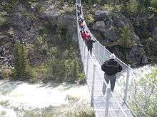 The Yukon Suspension Bridge is a pedestrian cable suspension bridge located on mile 46.5 on the South Klondike Highway in Northern British Columbia, Canada. It is 200 ft (60.96 metres) long and stretches 57 ft (17.36 metres) over the Tutshi River Canyon. There is an admission charge, and it is visited by over 25,000 people every summer between the months of May and September.