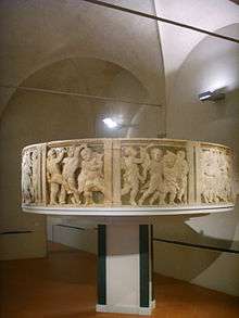 - the parapet of the external pulpit of the cathedral (1434-1438), made by Donatello and his school. Because of the degradation suffered during their five centuries outside, the reliefs were removed from the pulpit in 1967 and were substituted with replicas. A laborious restoration and cleaning (finished in 1999) directed by the Opificio delle pietre dure of Florence recreated a more unified and legible work. The imposing parapet takes the form of a small round temple with double pilasters that divide it into seven carved sections, each displaying a group of dancing figures which seem to move with joyous and vivacious steps, pictorically rendered thanks to the “stiacciato” (or very low relief) and the reflection of the tessera in the background.