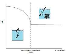 The critical micelle concentration (CMC) is the exact concentration of surfactants at which aggregates become thermodynamically soluble in an aqueous solution. Below the CMC there is not a high enough density of surfactant to spontaneously precipitate into a distinct phase.[6] Above the CMC, the solubility of the surfactant within the aqueous solution has been exceeded. The energy required to keep the surfactant in solution no longer is the lowest energy state. To decrease free energy of the system the surfactant is precipitated out. CMC is determined by establishing inflection points for pre-determined surface tension of surfactants in solution. Plotting the inflection point against the surfactant concentration will provide insight into the critical micelle concentration by showing stabilization of phases.[6]