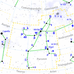 Theta Persei (Theta Per, θ Persei, θ Per) is a star system 37 light years away from Earth, in the constellation Perseus. The primary star is a yellowish dwarf (main sequence) star of spectral type F7V, which is somewhat larger and brighter than the Sun, but still within the range considered to have the potential for Earth-like planets. There is also a red dwarf companion of spectral type M1V, orbiting about 250 AU from the primary. The star's age is estimated to be 2.8 billion years but is certainly no less than 1.7 billion years and no greater than 3.9 billion years.[4]