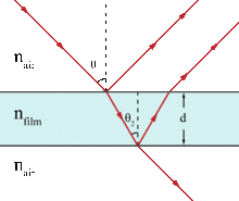 Where is the film thickness, is the refractive index of the film, is the angle of incidence of the wave on the lower boundary, is an integer, and is the wavelength of light.