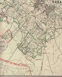 The EEF's occupation of Gaza was not strongly resisted and a general advance during the morning of 7 November found the town abandoned.[68] Orders for an attack at 04:50 by the 75th Division on Outpost Hill on the eastern side of Gaza had been issued; these were expanded to include Middlesex Hill and a 54th (East Anglian) Division attack on the Belah and Yunis trenches, and Turtle Hill in the coastal sector.[63][72][75] However, by 04:35, two battalions each from the 161st and the 162nd Brigades (54th Division) supported by artillery had already advanced to occupy Lion and Tiger Trenches and Sheikh Redwan in the coastal sector to the north-north-west of Gaza. The advance by the 162nd Brigade took them through "the gardens and fields of Gaza to the main road northwards", when patrols sent into the city found it deserted. British artillery had destroyed all the homes, of the 40,000 people who had lived in Gaza before the war. The 54th (East Anglian) Division subsequently took up a line stretching from the Jaffa road north of Sheikh Redwan to the Mediterranean sea.[82][83]