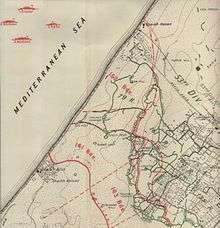 The EEF controlled the coastal sea lanes, and the Intelligence Service spread rumours about possible sea landings in the rear of Gaza. Ships were seen taking soundings off the coast and a fleet of small boats was located near Deir el Belah.[13] During the late afternoon of 1 November, an embarkation of members of the Egyptian Labour Corps onto motor launches, trawlers and tugs at Deir el Belah was staged as a feint, giving the appearance of continuing into the night. The next morning, two trawlers appeared off the mouth of the Wadi el Hesi north of Gaza.[14] To add to the confusion, between the Battle of Beersheba on 31 October and the main attacks at the Battle of Hareira and Sheria beginning on 6 November, the Ottoman left flank north of Beersheba was being fiercely contested during the Battle of Tel el Khuweilfe for control of the road to Hebron and Jerusalem. According to Wavell, "an assault on a portion of the Gaza defences was to be made by the XXI Corps."[13] The date of this attack, which was primarily a feint, was scheduled for between 24 and 48 hours before the attack on Sheria.[15]