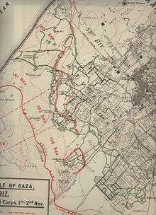 - ↑ The several battles fought for the Gaza to Beersheba line between 31 October and 7 November, were all assigned the title Third Battle of Gaza, although they took place many miles apart and were fought by different corps. [Battles Nomenclature Committee 1922 p. 32, Falls 1930 Vol. 2 Sketch Maps 1–9]
