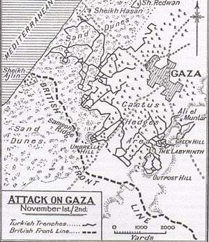 On 1 November, the assault of Umbrella Hill—a sand dune two thousand yards (1,800 m) south–west of Gaza to the west of the Rafa to Gaza road overlooking the main objectives—was to begin at 23:00.[37][38][50] The defending garrison was "assumed to be about 350 strong".[40] However, at 10:50 a preliminary move into No Man's Land was observed by Ottoman soldiers in Fisher's Orchard, who gave the alarm and began firing machine guns and rifles from the Ottoman trenches on Umbrella Hill.[51] At 23:00, an intense EEF bombardment began enabling a tape to be laid, along which the attacking troops formed up to launch their attack ten minutes later.[51] Under cover of the intense ten-minute bombardment, the 1/7th Battalion, Scottish Rifles with one company of 1/8th Battalion, Scottish Rifles (156th Brigade, 52nd (Lowland) Division) attacked Umbrella Hill.[49] After killing many of the defenders, they quickly captured the hill, three officers, fifty-five Ottoman soldiers, three Lewis guns and numerous bombs. The attackers suffered light casualties; however the sand dune was difficult to defend because the Ottoman trenches—without revetments—had virtually disappeared during the previous bombardments. The following Ottoman bombardment of Umbrella Hill caused 103 casualties to the 1/7th Battalion Scottish Rifles during the next twenty-four hours.[51] However, with the hill captured by the 52nd (Lowland) Division, the main attack could begin.[37]