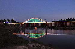The Tunga Bridge, also called Jayachamarajendra Bridge, is a bridge connecting Thirthahalli to Kuruvalli. This bridge has an arc-like structure at the top which is supported by consecutive pillars on either side of the bridge. [4] This bridge was designed by Sir M. Visvesvaraya. The bridge was completed in 1943, and inaugurated by the erstwhile H.H Jayachamarajendra Wadiyar, the then Maharaja of Mysore, also named after him. Now the bridge connects Thirthahalli to Koppa, Sringeri towns and is a part of NH 13.