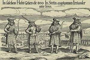 The majority of mercenaries recruited by Gustavus Adolphus were German,[56] but Scottish soldiers were also very numerous. These were composed of some 12,000 Scots already in service before the Swedes entered the war under the command of General Sir James Spens and colonels such as Sir Alexander Leslie, Sir Patrick Ruthven, and Sir John Hepburn. These were joined by a further 8,000 men under the command of James Marquis Hamilton. The total number of Scots in Swedish service by the end of the war is estimated at some 30,000 men,[57] no less than 15 of whom served with the rank of major-general or above.[58]