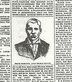 After being tried and sentenced to hang for the killing of Birdwell, Blanck used a fake gun to overwhelm the night jailer and escaped with the jailer's gun and jail keys on March 17, 1895.[5] Besides a con man named Frank Hart who helped Blanck, several other convicts also escaped with Blanck: Servius Rutten (convicted murderer); William Holmes (murderer); C.W. Brown (counterfeiter); R.H. Ford (burglar); Charles William (burglar); and William Cosgrove (petty larceny).