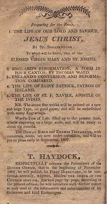 Thomas Haydock (1772–1859), born of one of the oldest English Catholic Recusant families, was a schoolmaster and publisher. His dedication to making religious books available to fellow Catholics suffering under the English Penal Laws came at great personal cost. He is best remembered for publishing an edition of the Douay Bible with extended commentary, compiled chiefly by his brother George Leo Haydock. Originally published in 1811 and still in print, it is one of the most enduring contributions to Catholic biblical studies.