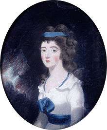 Sometime before his eighteenth birthday in 1787 Lawrence arrived in London, taking lodgings in Leicester Square, near to Joshua Reynolds' studio. He was introduced to Reynolds, who advised him to study nature, rather than the Old Masters. Lawrence set up a studio at 41 Jermyn Street and installed his parents in a house in Greek Street. He exhibited several works in the 1787 Royal Academy exhibition at Somerset House, and enrolled as a student at the Royal Academy but didn't stay long, abandoning the drawing of classical statues to concentrate on his portraiture. In the Royal Academy exhibition of 1788 Lawrence was represented by five portraits in pastels and one in oils, a medium he quickly mastered. Between 1787 and his death in 1830 he would miss only two of the annual exhibitions: once, 1809, in protest about the way his paintings had been displayed and once, in 1819, because he was abroad. In 1789 he exhibited 13 portraits, mostly in oil, including one of William Linley and one of Lady Cremorne, his first attempt at a full-length portrait.[11] The paintings received favourable comments in the press with one critic referring to him as "the Sir Joshua of futurity not far off" and, aged just twenty, Lawrence received his first royal commission, a summons arriving from Windsor Palace to paint the portraits of Queen Charlotte and Princess Amelia.[12] The queen found Lawrence presumptuous (although he made a good impression on the princesses and ladies-in-waiting) and she didn't like the finished portrait, which remained in Lawrence's studio until his death. When it was exhibited at the Royal Academy in 1790, however, it received critical acclaim.[13] Also shown that year was another of Lawrence's most famous portraits, that of the actress Elizabeth Farren, soon to be the Countess of Derby, "completely Elizabeth Farren: arch, spirited, elegant and engaging", according to one newspaper.[14]
