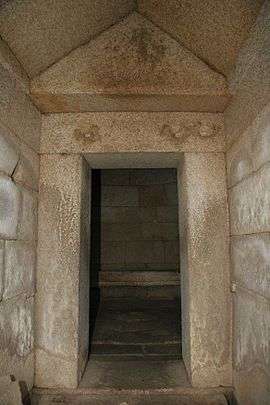 It is composed of a representative façade, a small antechamber and a domed chamber. The entrances have been closed with double stone doors. The floor of the antechamber is made of rammed soil, while the domed chamber is made up of specially fitted stones. In the center of the domed chamber there is a circular granite block. On the floor underneath it is a cavity surrounded by a ring of stones resembling the cult fireplaces in Seutopolis. Opposite to the entrance, there is a bed with east-west orientation. The temple was used for a funeral of a ruler or a nobleman. It was robbed of its valuables in antiquity, but parts of a gilt breast plate, two small gold ornaments, and bones of horses were found during excavations in the antechamber.