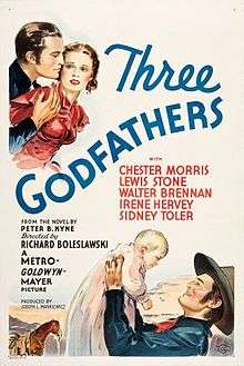 Three Godfathers is a 1936 western film, adapted from the novel of the same name by Peter B. Kyne. Three bank robbers find a newborn baby and his dying mother in the desert. Director John Ford remade the story in 1948 with 3 Godfathers, starring John Wayne.[1]