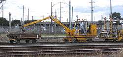 A tie crane or tie handler, is a piece of rail transport maintenance of way equipment used to move and handle the railroad ties (sleepers) used in rail tracks using track relaying. The machines are used as an alternative to the manual labour once used.