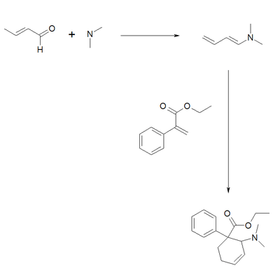 It is manufactured by a Diels-Alder reaction of 1-N,N-dimethylaminobuta-1,3-diene with ethyl atropate, yielding a mixture of isomers,[12] of which only the (E)-(trans)-isomers are active and are separated subsequently from the mixture by precipitation of the inactive (Z)-(cis)-isomers as zinc complex.[8] The inactive (Z)-(cis)-isomers may be epimerized to the more thermodynamically favored (E)-(trans)-isomers via reflux in diluted phosphoric acid.
