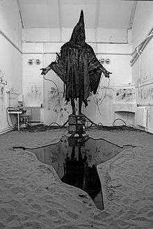 The influence of myth, seen in Shaw's early work, is once again present in his 2008 sculpture, Minotaur, a piece that was commissioned to mark the opening of Harrison Birtwistle's Opera, The Minotaur.[9] After this, however, the more political side to his work becomes increasingly evident with a number of sculptures responding to issues such as terrorism and the war in Iraq.[10] At this time Shaw was working in London as a Fellow sculptor at the Kenneth Armitage Foundation. The main works he produced during this 2006 to 2008 residency were Man on Fire: What God of Love Inspires Such Hate in the Hearts of Men, Tank on Fire (awarded the selectors' choice Threadneedle prize in 2008),[11] and the multi-sensory installation Casting a Dark Democracy – Shaw's haunting response to the now infamous image of the Abu Ghraib prisoner, described as "one of too few works to engage unequivocally with the reality and human cost of the Iraq war."[12]