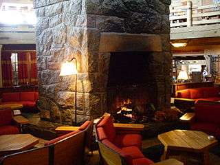 Timberline Lodge, a mountain lodge and resort hotel, is a four-story structure comprising approximately 40,000 square feet. The ground-level exterior walls are heavy rubble masonry, using boulders from the immediate area, and heavy timber is used from the first floor up. The central head house section is hexagonal and 60 feet in diameter, with a six-sided stone chimney stack 92 feet high and 14 feet in diameter. Each of the six fireplace openings—three on the ground floor, three on the first floor—is five feet wide and seven feet high. Two wings, running west and southeast, flank the head house. Oregon woods used throughout the building include cedar, Douglas fir, hemlock, western juniper and ponderosa pine.[7]
