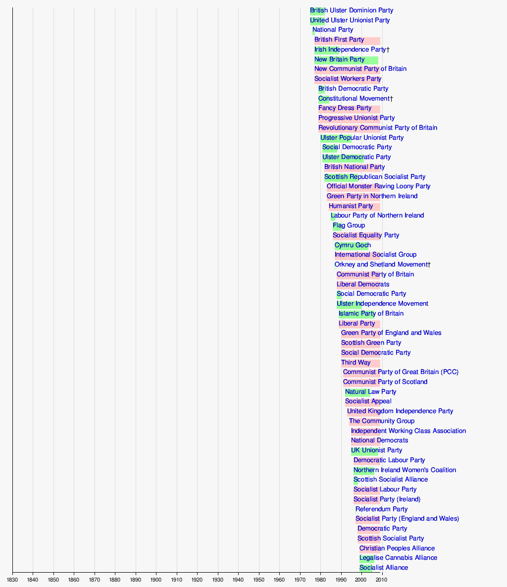 The following timeline of political parties in the United Kingdom shows the period during which various parties were active, from their date of establishment to their date of dissolution. Defunct parties are shown in green, and currently active parties are shown in pink. An asterisk or dagger indicates that the exact year of establishment or dissolution, respectively, is not certain. Where a party has changed its name over the course of its existence, only the most recent name is given.