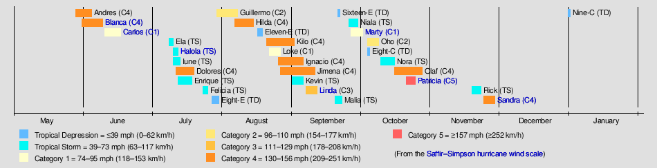 The 2015 Pacific hurricane season was the second-most active year on record, and featured the strongest tropical cyclone ever observed in the Western Hemisphere: Hurricane Patricia.[1] The season officially started on May 15 in the eastern Pacific—east of 140°W—and on June 1 in the central Pacific—between the International Date Line and 140°W—and lasted until November 30. These dates typically cover the period of each year when most tropical cyclones form in the eastern Pacific basin.[2] The season's first storm, Hurricane Andres, developed on May 28; the season's final storm, Hurricane Sandra, degenerated on November 28.