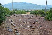 The hill has an elevation of 280 meters above sea level and overlooks the coastal plain of Sibari and the Gulf of Taranto. It is on the northern bank of the seasonal Raganello river. Close to the hilltop is the acropolis, which was the location of a sanctuary with three temples. The acropolis was surrounded by a defensive wall. Several terraces with evidence of settlement are located further downhill and the Macchiabate necropolis lies at the foot of the hill.[1] The ancient Greek city of Sybaris was located at a distance of 15 kilometers to the southeast.
