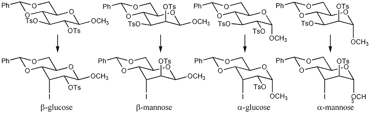 The reaction of β–mannopyranosides gives low yields and required longer reaction times than with β-glucopyranosides due to the presence of a neighboring axial substituent (sulfonyloxy) relative to C-3 sulfonyloxy group in the starting material.[4] The axial substituent increases the steric interactions in the transition state, causing unfavorable eclipsing of the two sulfonyloxy groups. α-Glucopyranosides possess a β-trans-axial substituent relative to C-3 sulfonyloxy (anomeric OCH3 group) in the starting material. The β-trans-axial substituent influences the transition state by also causing an unfavorable steric interaction between the two groups. In the case of α-mannopyranosides, both a neighboring axial substituent (2-sulfonyloxy group) and a β-trans-axial substituent (anomeric OCH3 group) are present, therefore significantly increasing the reaction time and decreasing the yield.[3]