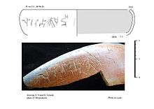 Tissamaharama Tamil Brahmi inscription refers to a fragment of black and red ware flat dish inscribed in Tamil in the Tamil Brahmi script excavated at the earliest layer in southern town of Tissamaharama in Sri Lanka. It is dated to approximately 200 BC by German scholars who undertook the excavation. The inscription is mix of Brahmi letters and Graffiti symbols. The words are read from right to left and from left to right to mean thiraLi muRi. There are conflicting interpretations of what is read as inscribed.[1][2] The Tamilnet new site reported that the inscribed pottery was potentially misplaced or lost.[3]The Daily Mirror newspaper in an Op-ed page reported that the local archeologists have not seen the artifact for review.[4]