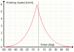 Tobler's hiking function - walking speed vs. slope angle chart.