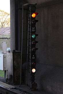 | Stop. Passing this signal trips the train stop. | |