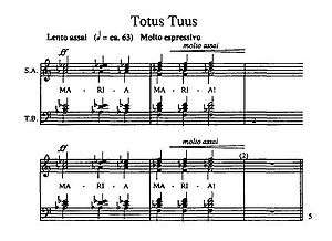 The libretto was taken from a poem written by contemporary writer Maria Boguslawska which is addressed to the Virgin Mary, the patron saint of Poland.[4] Totus Tuus's form is ABA'CD, and marks a return to the simple homophony characteristic of Górecki's earlier Marian Songs.[5] The composition's texture utilises homophony to allow for a clear voice for the libretto, while the simple chant form is repeated to slowly build a musical affirmation of faith. Gorecki used a homophonic texture in other Marian compositions such as 1985's Marian Songs, Op. 54, and Under your Protection, Op. 56.[5] This simplification of texture also occurs in Gorecki's most famous work, Symphony No. 3, where a similarly simple, diatonic language is employed to evoke the sparse and repetitive mood of Holy minimalism.[6]