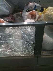Tempered safety glass, which has been laminated, often does not fall out of its frame when it breaks – usually due to the anti-splinter film applied on the glass, as seen in this grocery store meat case.