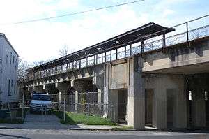 The station opened on February 23, 1886.[2][3] Formerly a surface station, it and the Port Richmond station one stop east were elevated onto the current concrete trestle in 1935 as part of an SIRT grade crossing elimination project, opening as an elevated station on February 25, 1937.[2][4][5][6][7][8] West of the station past Nicholas Avenue, the line recedes into an open-cut.[4] Tower Hill station closed on March 31, 1953, along with the South Beach Branch and the rest of the North Shore Branch.[2][8] It is one of the few stations along the North Shore line still standing, although in ruins.