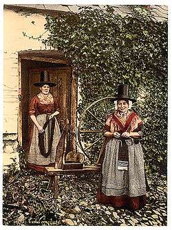 The traditional Welsh costume is a costume once worn by rural women in Wales. It was identified as being different from that worn by the rural women of England by many of the English visitors who toured Wales during the late 18th and early 19th centuries. It is very likely that what they wore was a survival of a pan-European costume worn by working rural women. This included a version of the bedgown, originally worn by the gentry in the 17th and 18th centuries, an item of clothing that survived in Wales for longer than elsewhere in Britain. The unique Welsh hat, which first made its appearance in the 1830s, was used as an icon of Wales from the 1840s.[1]