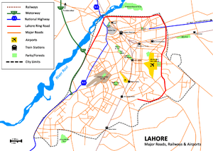 The Lahore Metro or Lahore Rapid Mass Transit System (LRMTS) is an under construction rapid transit system (metro train system) for Lahore, the second largest city of Pakistan.[8] First proposed in 1991, funding was not secured, and in 2012 it was abandoned by the Punjab government in favour of the more cost–effective Lahore Metro Bus System which opened in February 2013. However, the Punjab Government decided to restart development on the Lahore Metro as a $1.6 billion project[9] with Chinese assistance. The Orange Line, which will be 27.1-kilometre (16.8 mi) long (25.4 kilometres (15.8 mi) of which will be elevated),[10] will be the first line of the project and is under construction.[9]