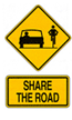 The third sign is the most rare of all, with a car on the left side, a cyclist on the right, and a sign saying "Share the road". This sign is located on busy road where it is narrow enough that motorists and cyclists have to share a lane.